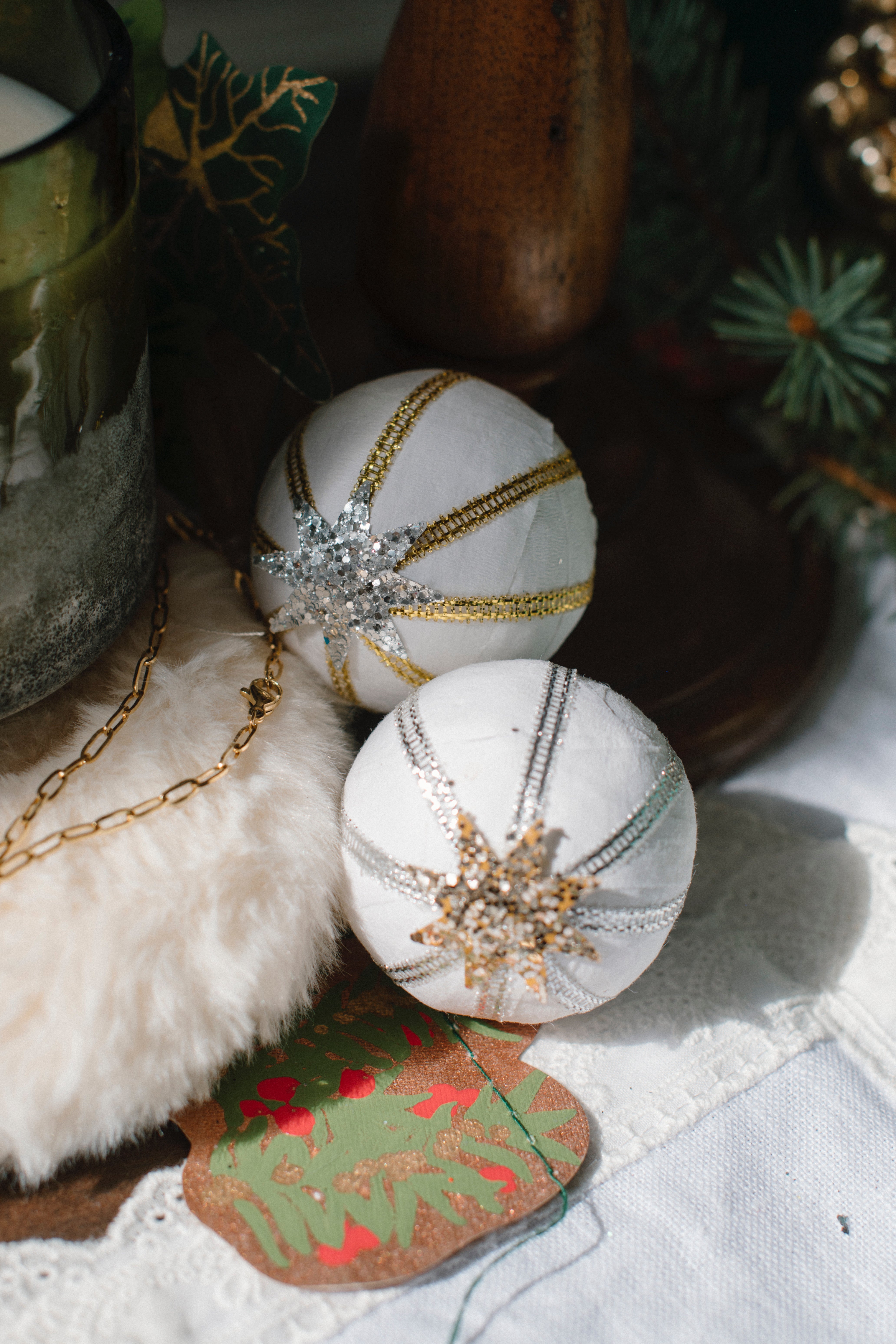 • The balls are covered with white crepe paper, gold or silver ribbons, and gold or silver glitter star stickers