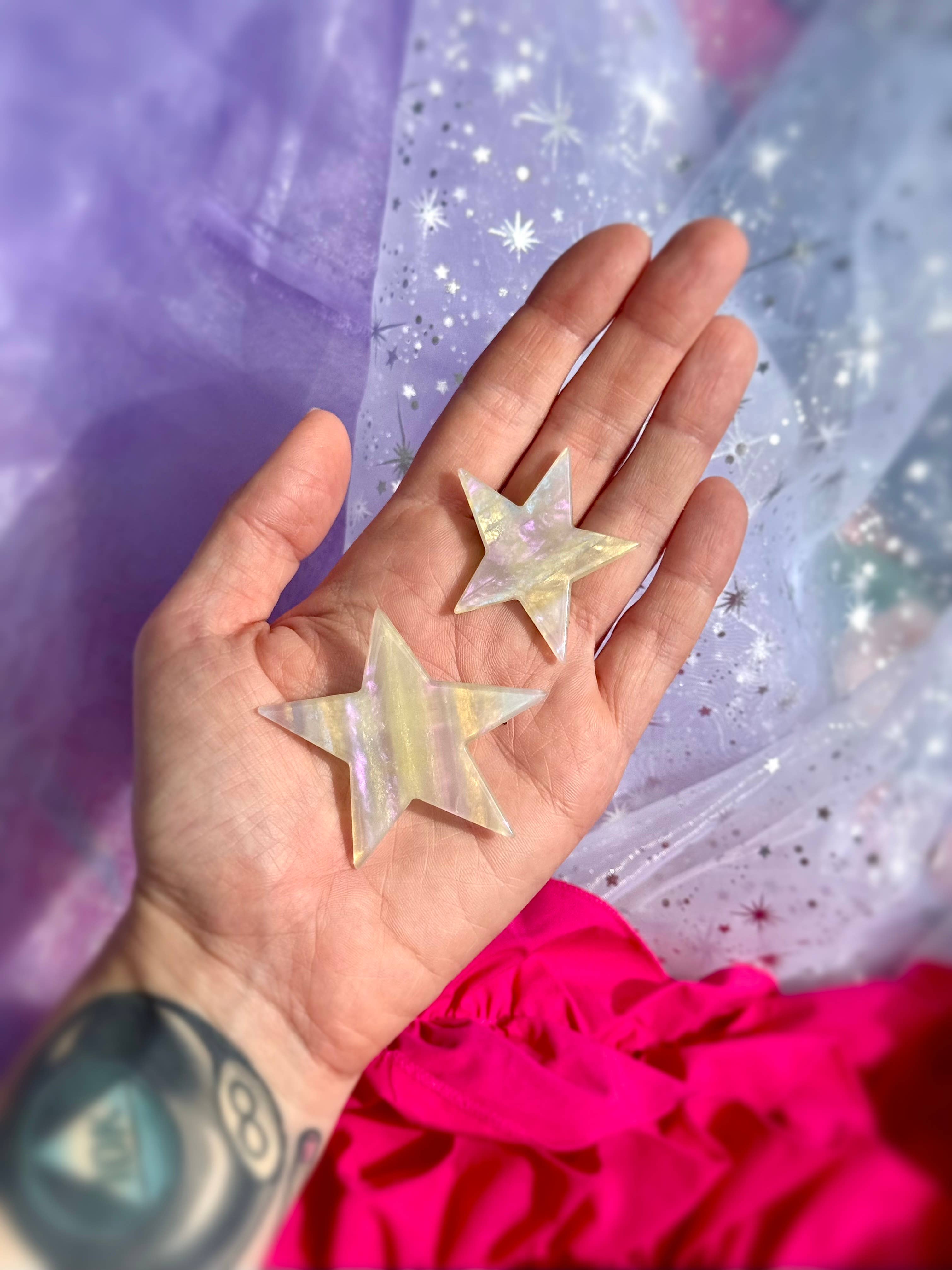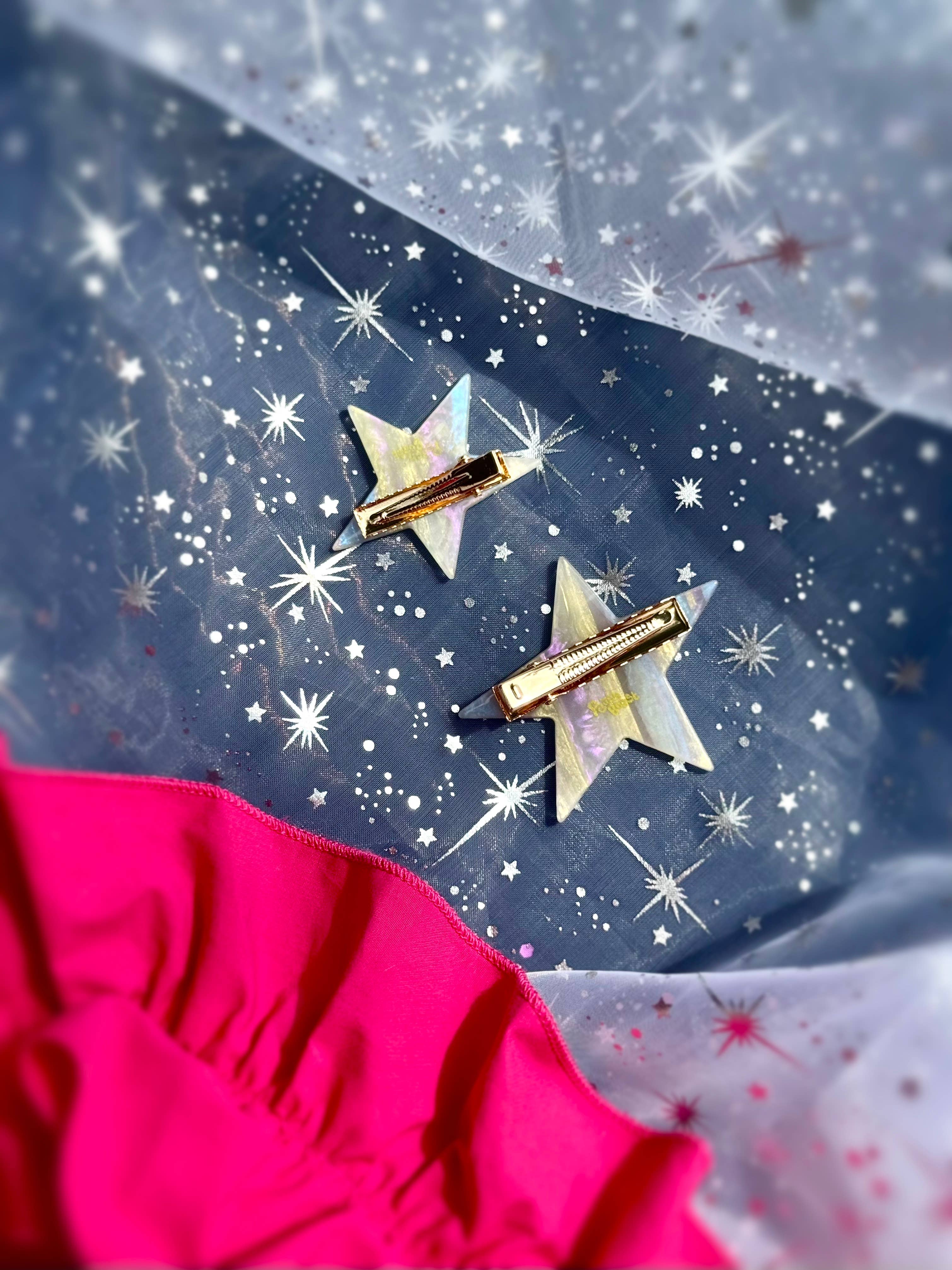 These beautiful iridescent star clips are the perfect statement for the holidays! ⭐️ Made with bio-plastic, not petroleum! ⭐️ Complete with iridescent finish ⭐️ 2" and 3" long each. Come as a set. ⭐️ Strong hold with alligator style clip
