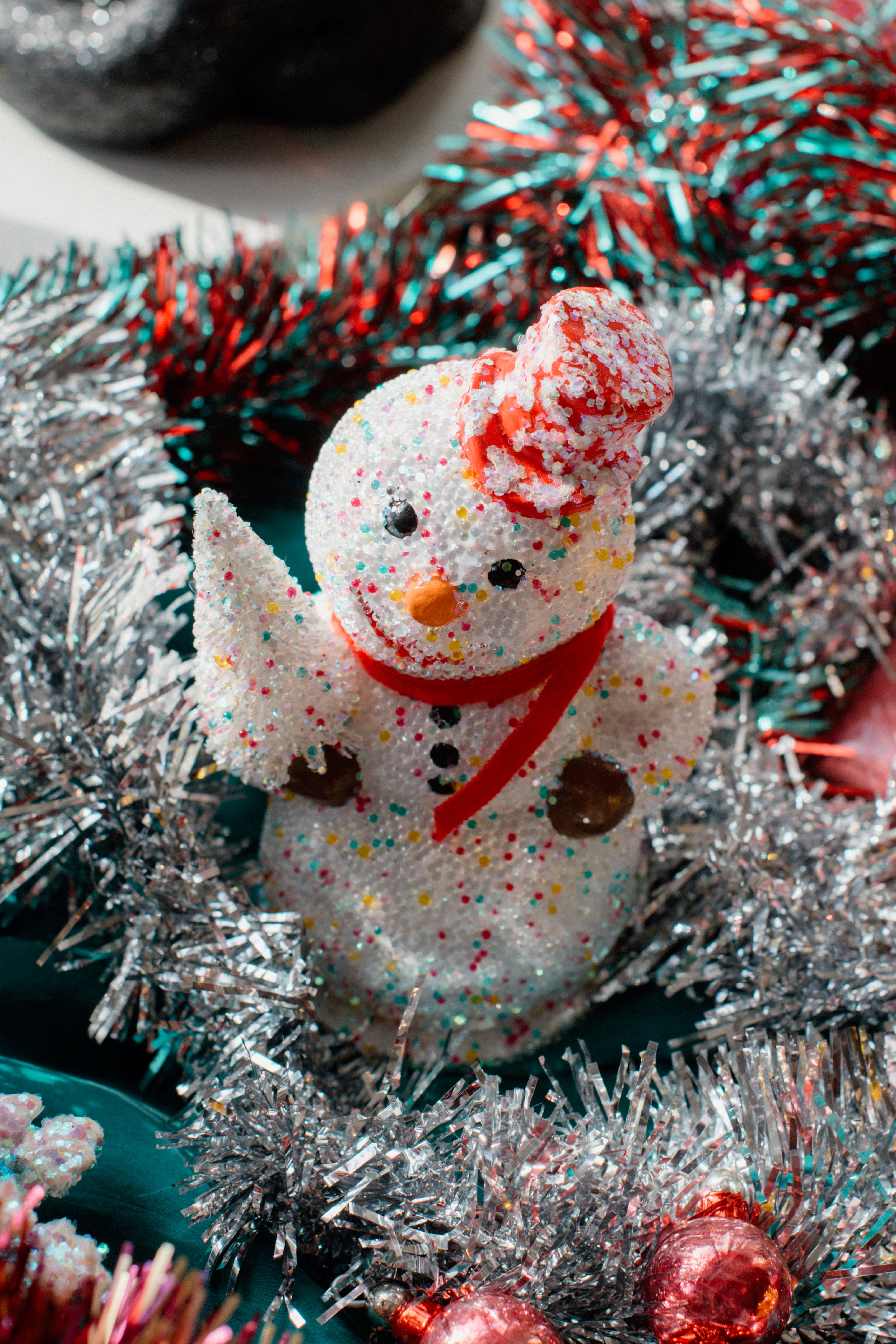 This snowman is adorned with glass beads is 5" tall and comes with an identification badge on the bottom.