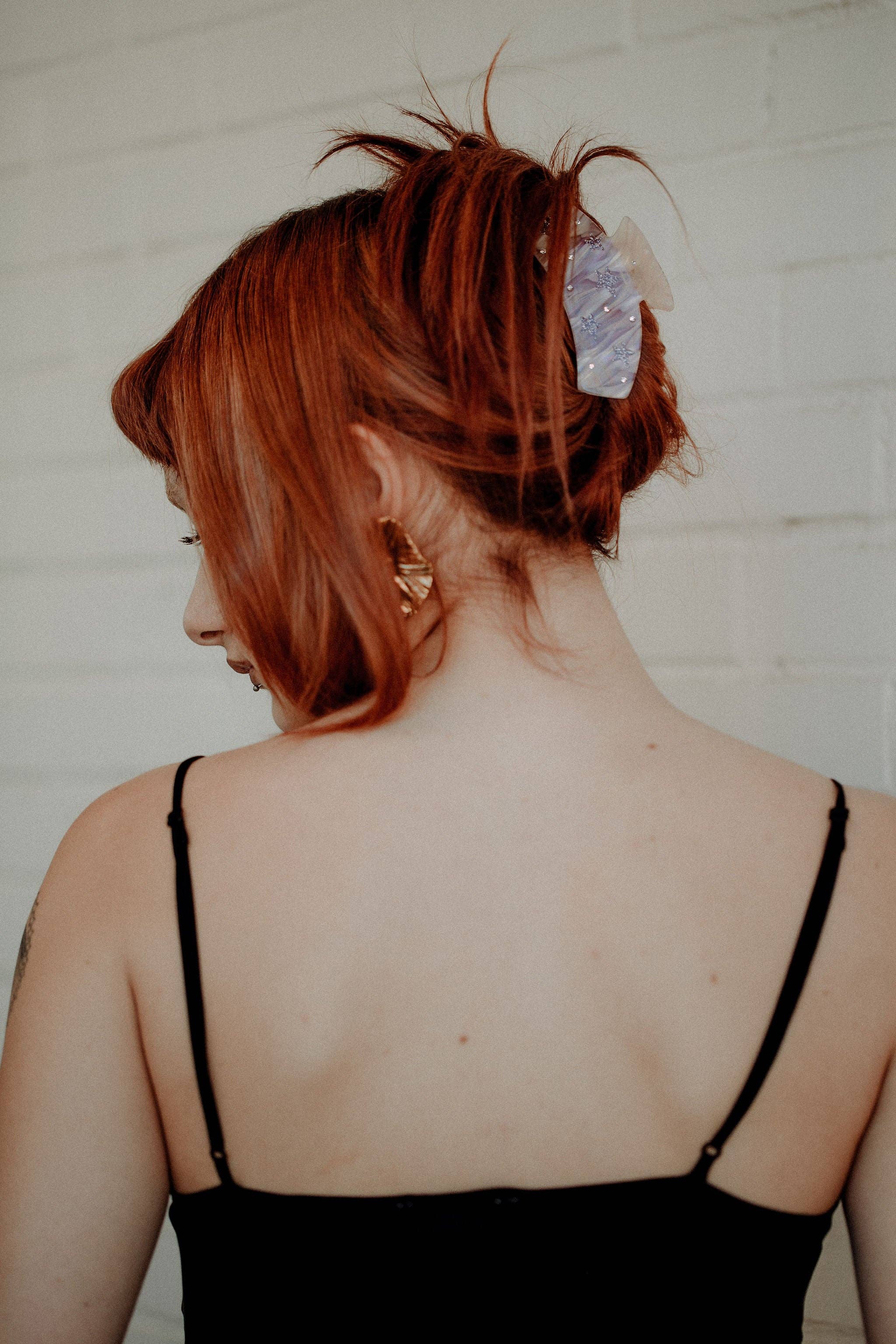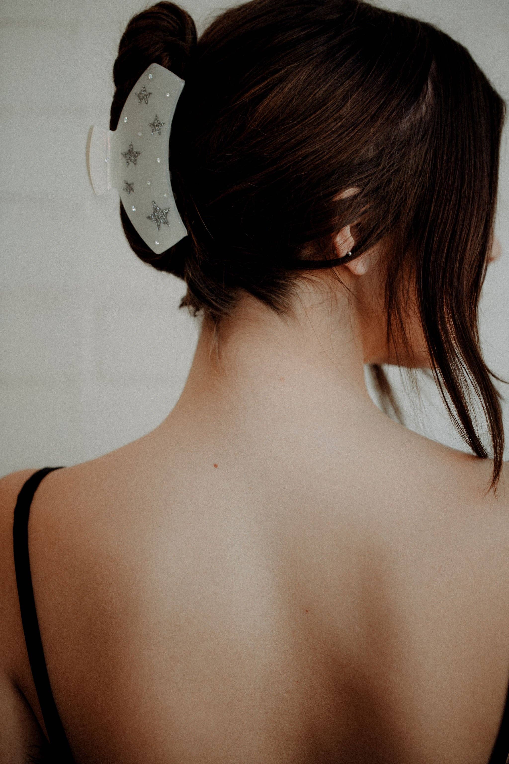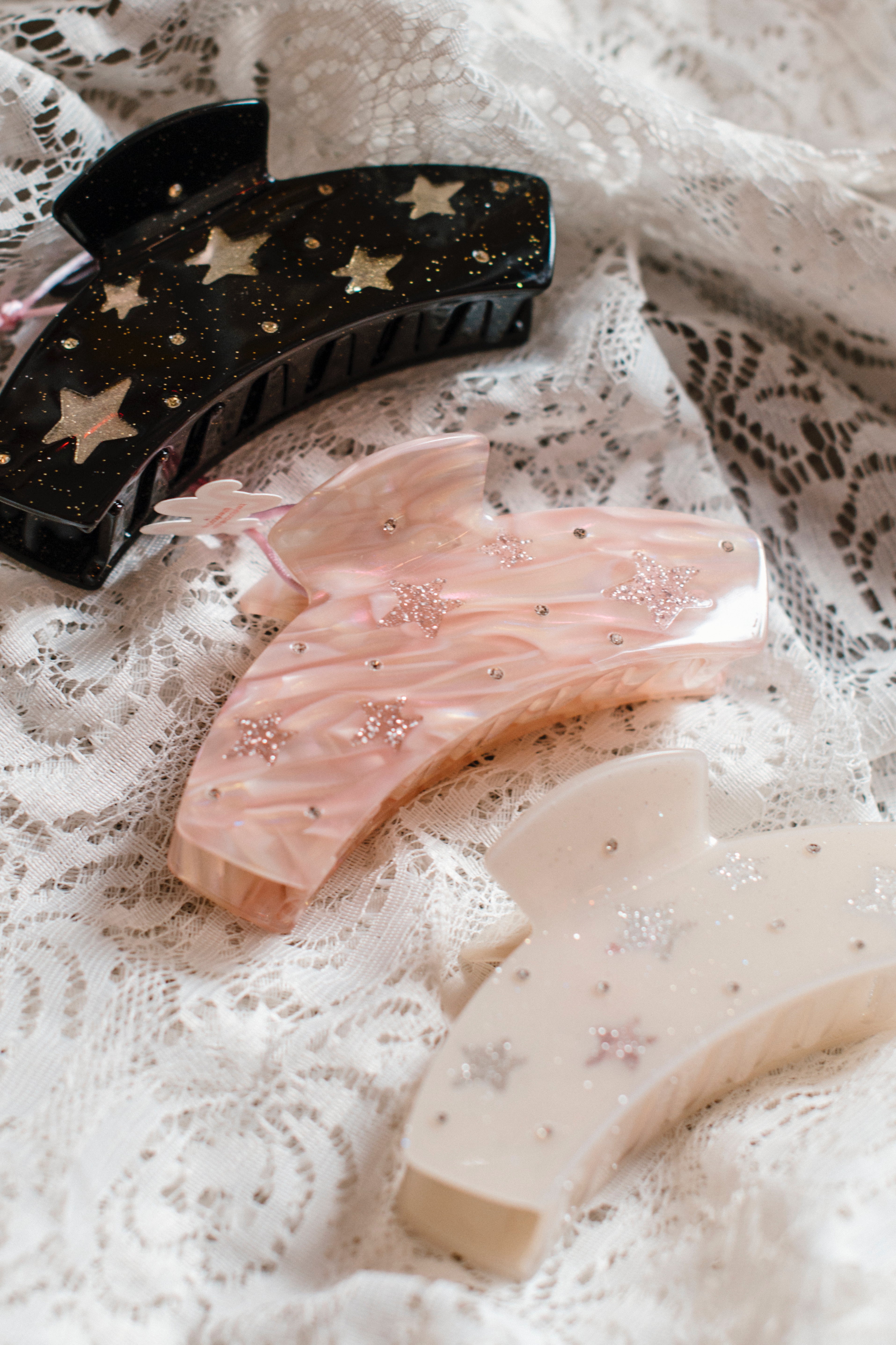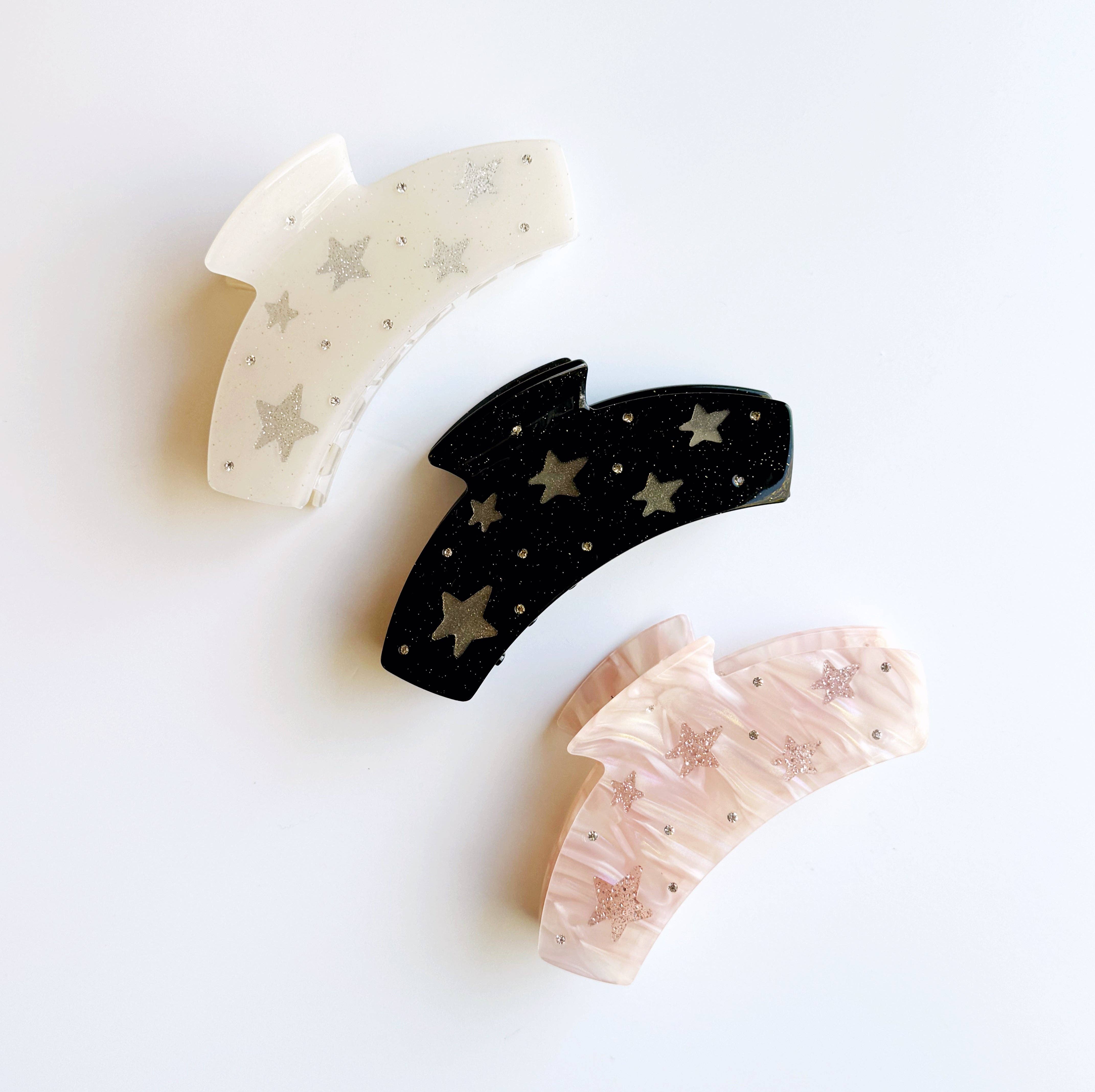 Get ready to shine. The Shimmer Claw features hand spliced glitter stars on a shimmery background. A comfy, curvy body makes this claw perfect for all hair types. * 4.25 inches Designed in Austin, Texas and responsibly made in China, the Shimmer Claw is hand spliced together from plant-based cellulose acetate. Due to the nature of the materials and process, each piece is unique and small variations will occur.