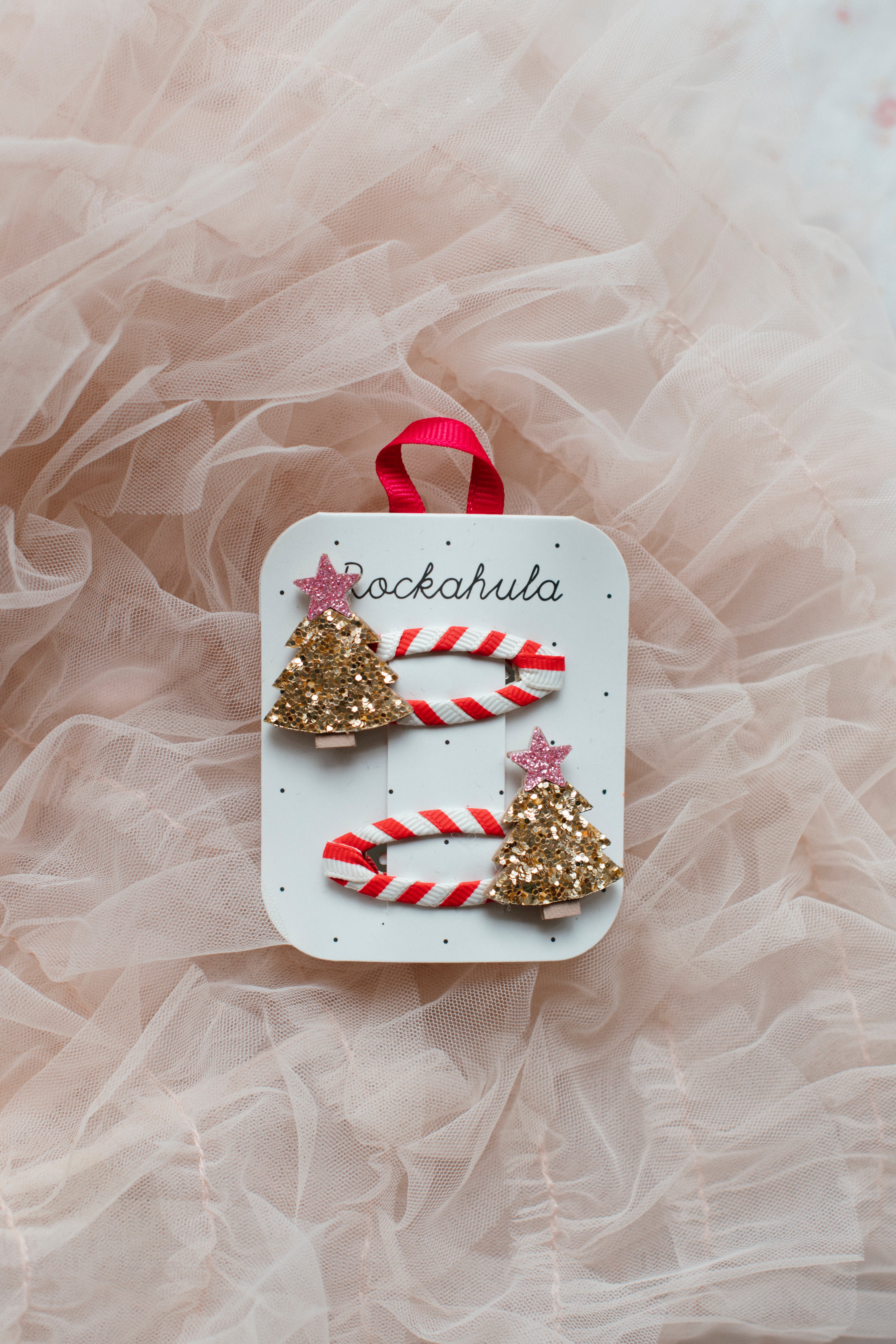 Sparkle your way through the Christmas season in these super fun Christmas tree clips! In chunky gold glitter, with pink glitter star toppers, each tree is secured to red and cream striped ribbon wrapped snap clips. Made using recycled glitter, ribbon and felt.