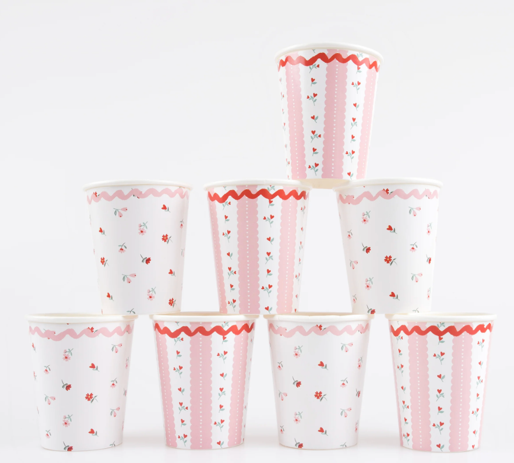 These beautiful, vintage-inspired designs, based on antique floral wallpapers and tablecloths, are perfect for setting the mood for a romantic celebration. Look closely, and you'll notice the romantic red rose pattern includes heart-shaped buds. It's this meticulous attention to detail, combined with a fabulous ricrac border, that makes these pink and red Valentine's cups so special.