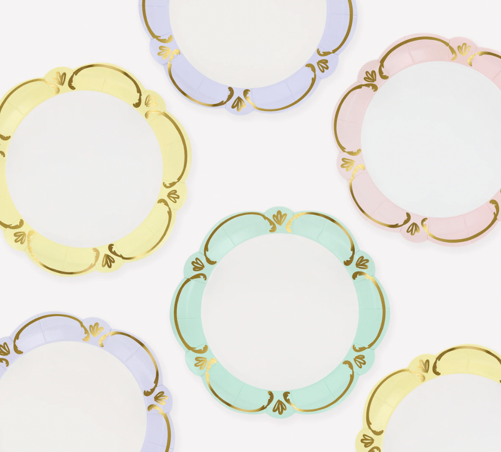 Inspired by the ornate elegance of rococo design, these exquisite paper side plates come in a harmonious palette of pastel blue, pink, yellow and green. Made with a softly waved edge and gold foil illustrated details, they echo the beauty of antique ceramics with a modern twist. The reverse side features a matching pastel shade for a beautifully co-ordinated look from every angle. Perfect for alfresco lunches, high teas, spring soirées, or bridal showers, they'll bring effortless refinement and a sense of celebration to every occasion.