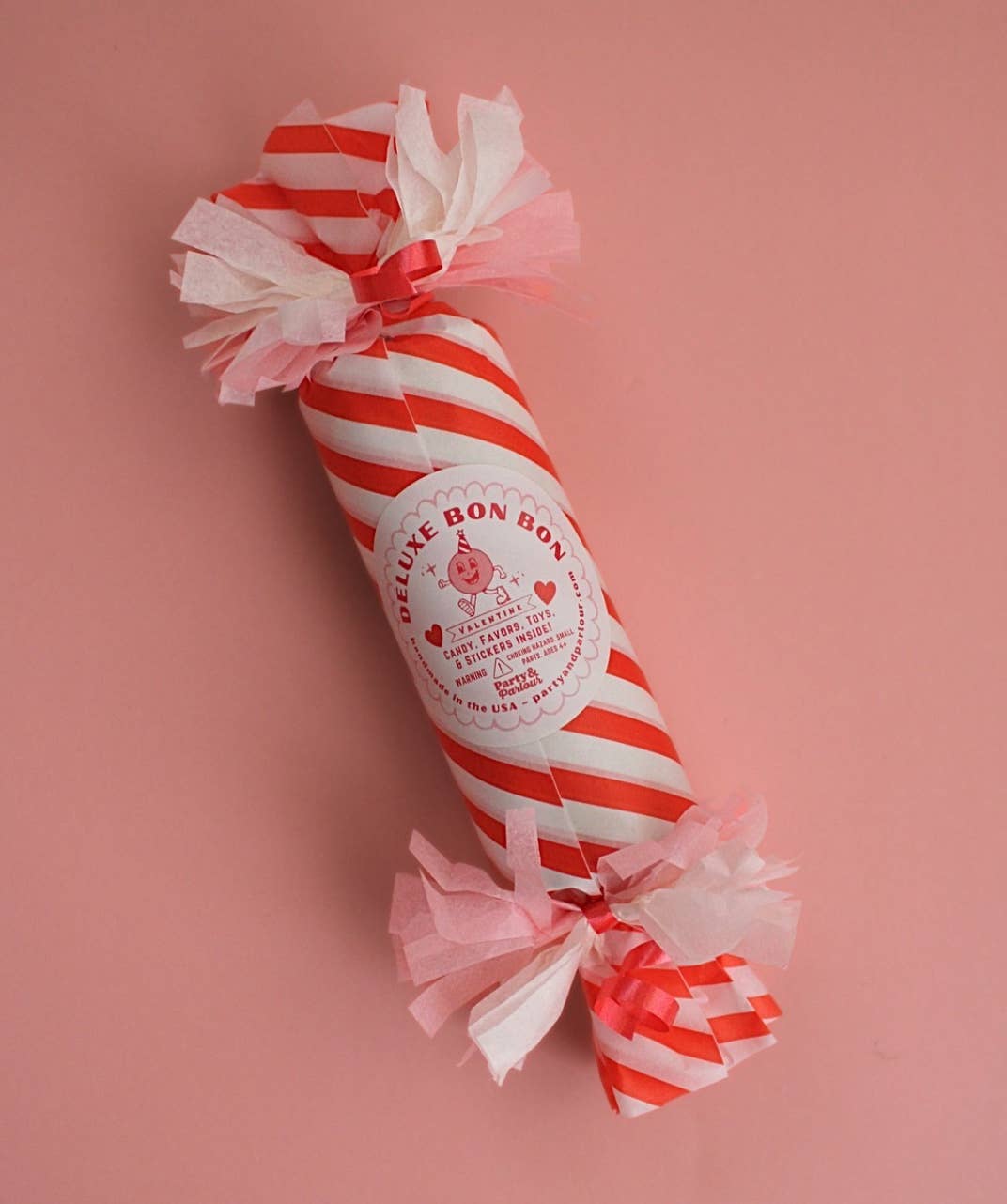 Our vintage inspired small batch deluxe bon bon surprises are not only adorable but they're a blast to unwrap all of the little goodies hidden inside! This Valentine's Day themed bon bon is filled with an assortment of sweets, stickers, favors, toys, temporary tattoo, silly joke or fortune and confetti.